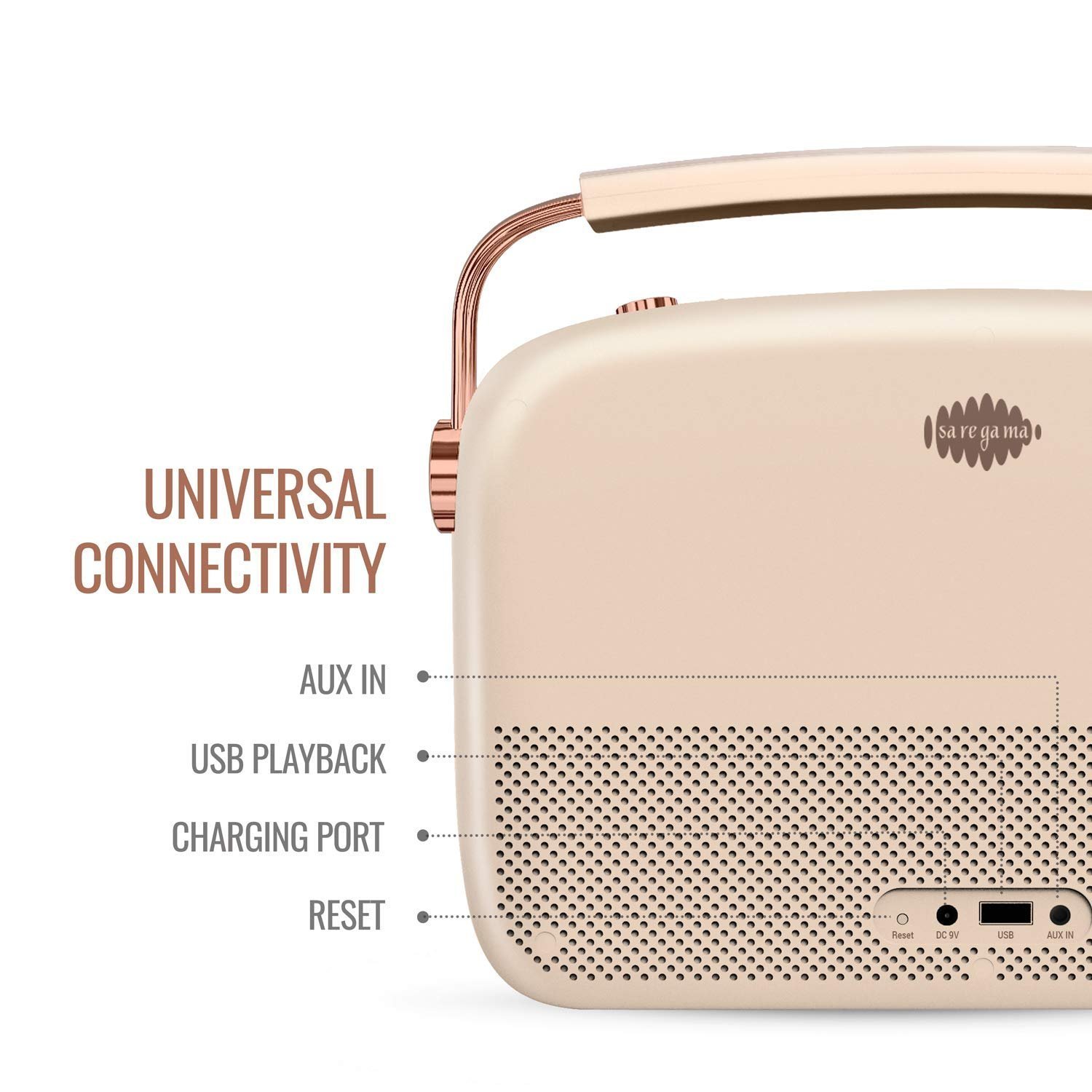 The digital audio player offers 4 modes – Saregama, USB/AUX IN, FM/AM and Bluetooth.